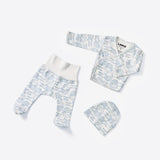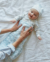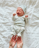 This is the sweetest set for the littlest little. We've updated this fan favorite a bit to make it even better. The wrap-style top with hand-covers snaps on the side to avoid baby’s sensitive belly button. The pant has a new wider, soft waistband that goes nice and high on baby's belly. The footed pant + hat help keep baby extra warm. Now in more than one size for longer use!