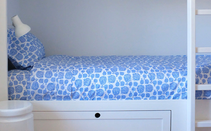 Oyster is a customer favorite for its beautiful graphic nature, and especially so in Denim, our soft navy. The Oysters look so special in their little grouping, surrounded by white.