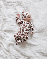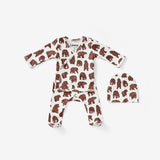 This is the sweetest set for the littlest little. We've updated this fan favorite a bit to make it even better. The wrap-style top with hand-covers snaps on the side to avoid baby’s sensitive belly button. The pant has a new wider, soft waistband that goes nice and high on baby's belly. The footed pant + hat help keep baby extra warm. Now in more than one size for longer use!